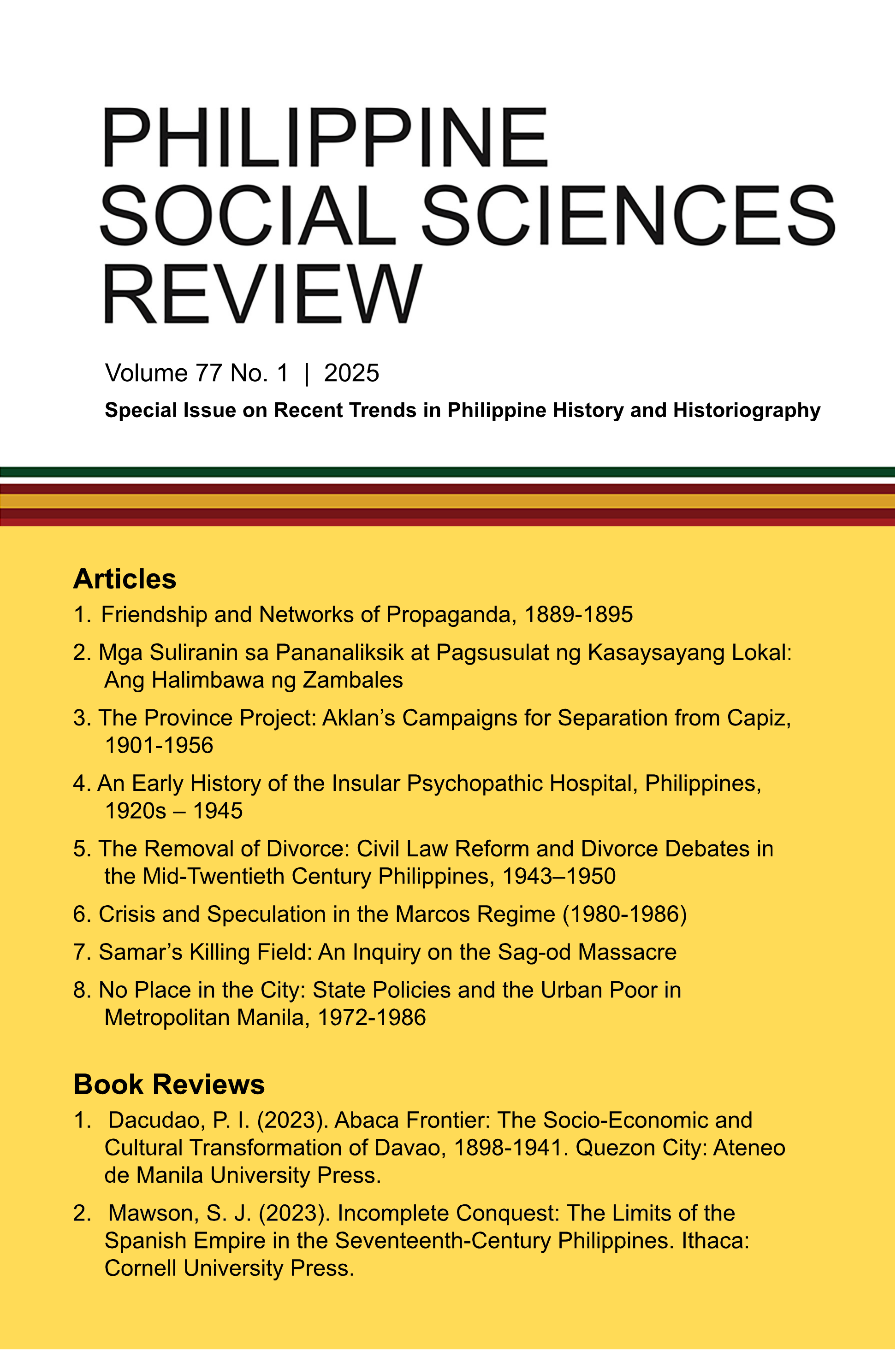 | Samar’s Killing Field: An Inquiry on the Sag-od Massacre | Philippine Social Sciences Review | Aaron F. Viernes | Martial Law, Human Rights, Sag-od Massacre, Counterinsurgency, Samar | 2025 |